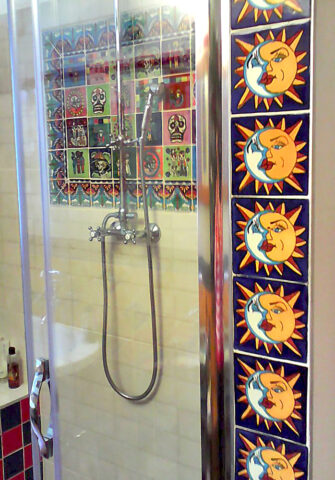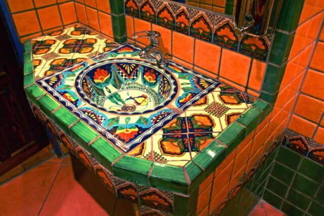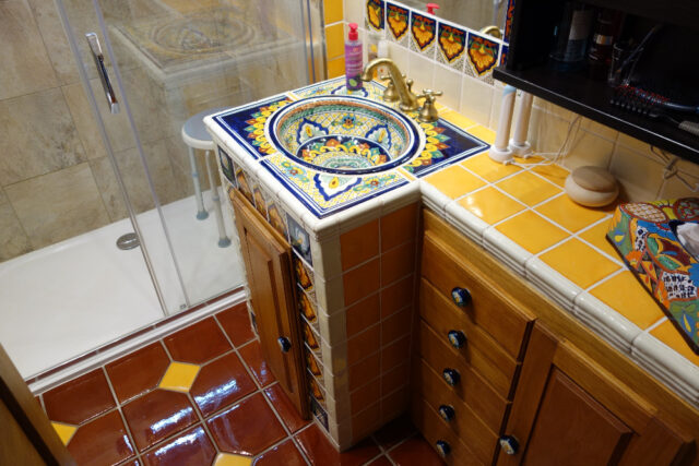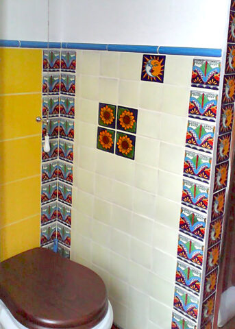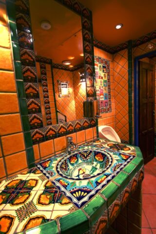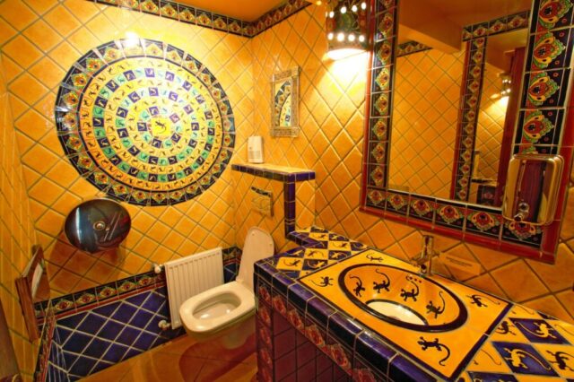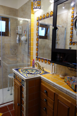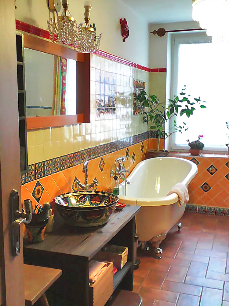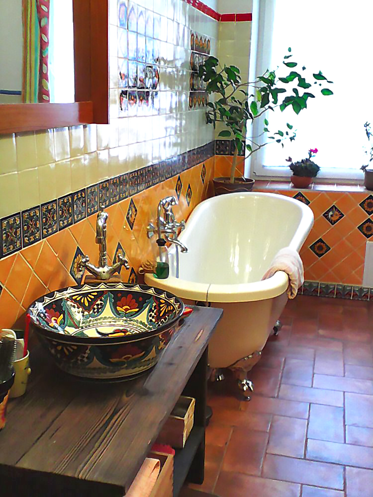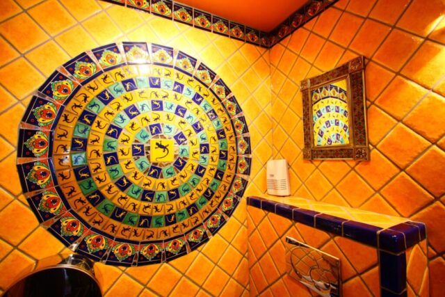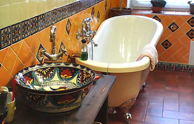 Tato koupelna přesvědčivě ukazuje, jak lze pomocí mexických obkladů a umyvadla oživit to nejlepší z koloniální estetiky. Dekor Vallarta odkazuje na atmosféru mexických přímořských měst – bohaté ornamenty, teplé žluté a terakotové tóny a ručně malované detaily vytvářejí dojem stability a tradice.