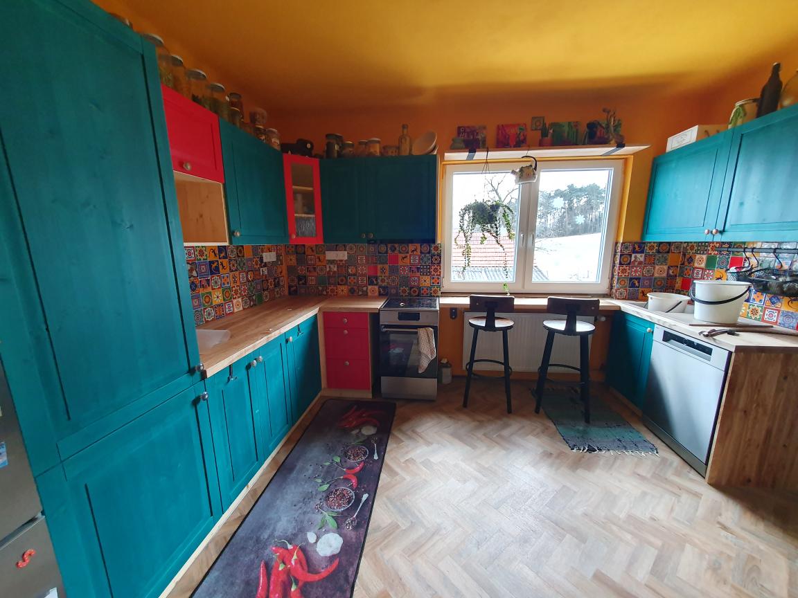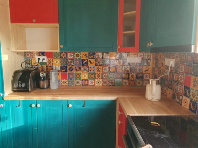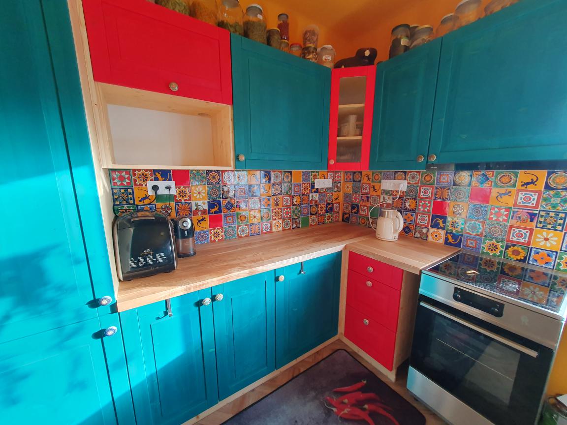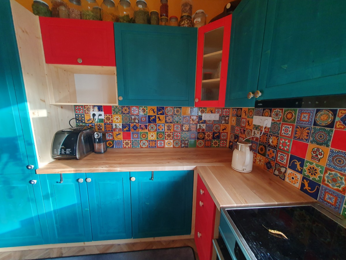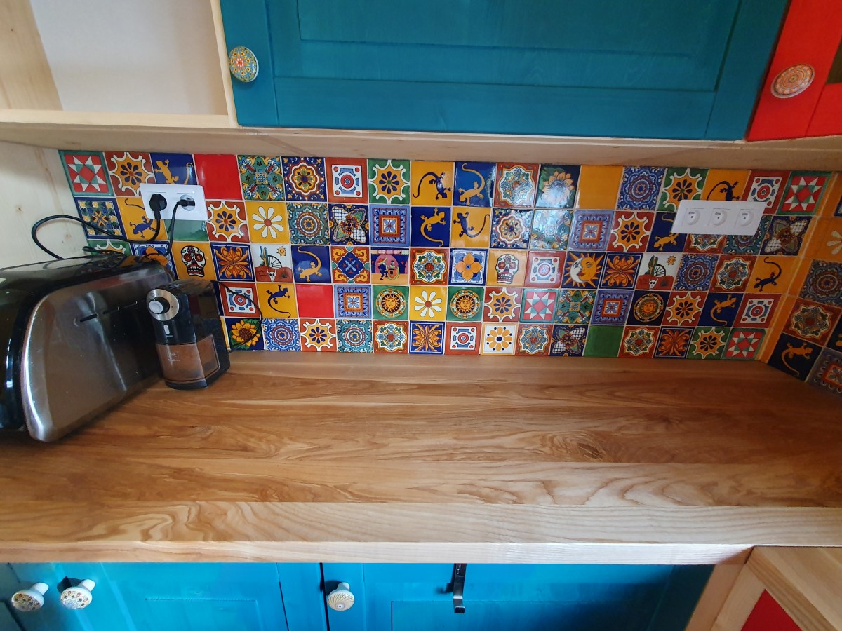 Tato realizace ukazuje, jak silný vizuální i atmosférický efekt dokážou vytvořit mexické ručně dekorované obklady v kombinaci s typickou aztéckou barvou – tyrkysovou. Drobné nepravidelnosti ručních obkladů, syté barvy a tradiční motivy dodávají prostoru autenticitu, živost a osobitý charakter, který nelze nahradit sériovou výrobou. Sítotisková dekorace podtrhuje řemeslný původ obkladů a vytváří bohatou mozaiku detailů, která kuchyni proměňuje v výrazný designový prvek celého interiéru.